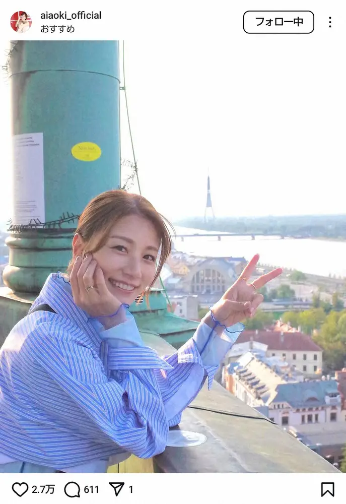 青木は「40歳になりました」と報告。「30代が想像以上に楽しかったので、40代も期待大」とつづり、青いストライプのシャツ姿でピースサインをする写真を公開した。