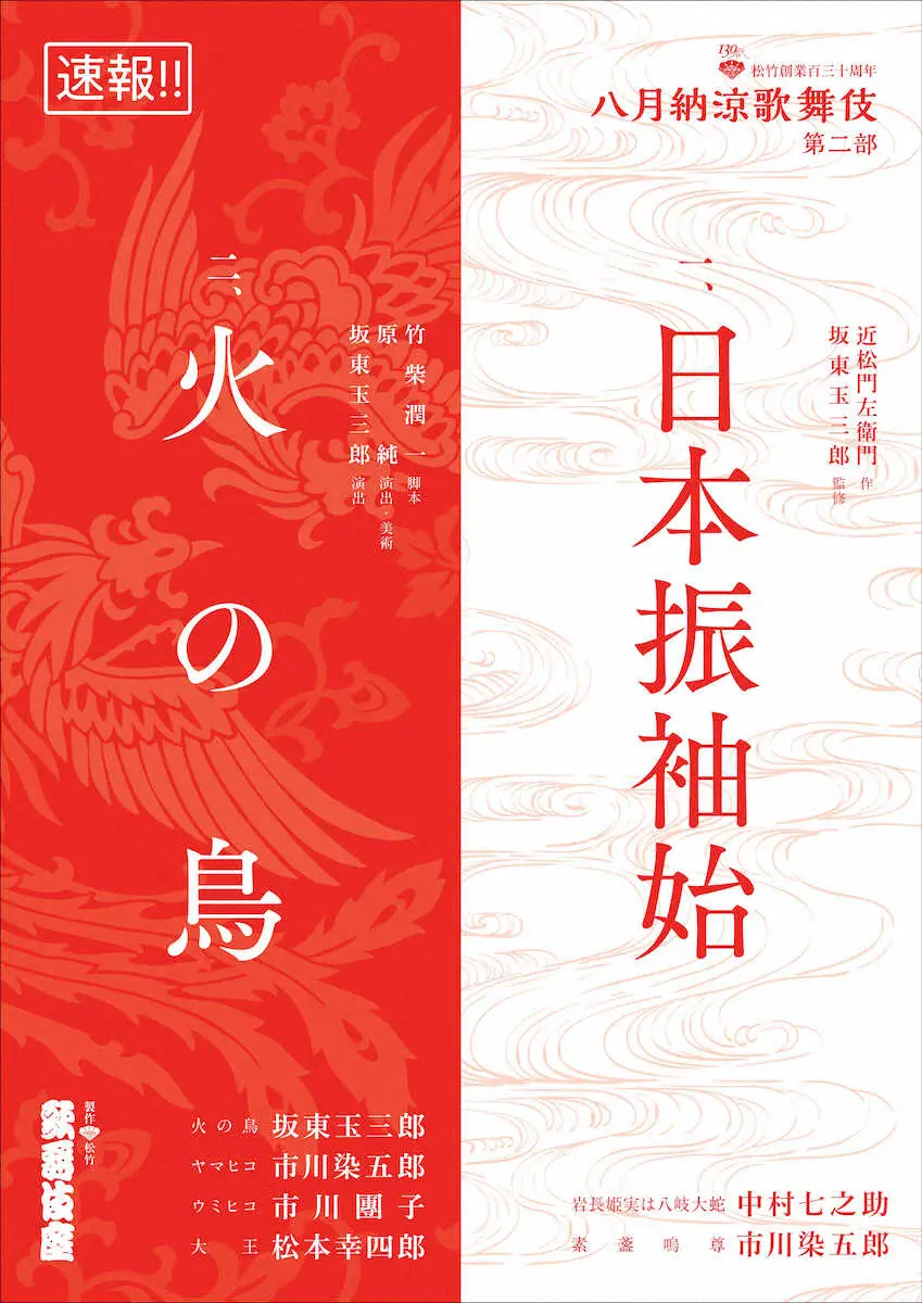東京・歌舞伎座で8月に行われる「八月納涼歌舞伎」第2部で「日本振袖始」「火の鳥」が上演されることが14日、発表された。