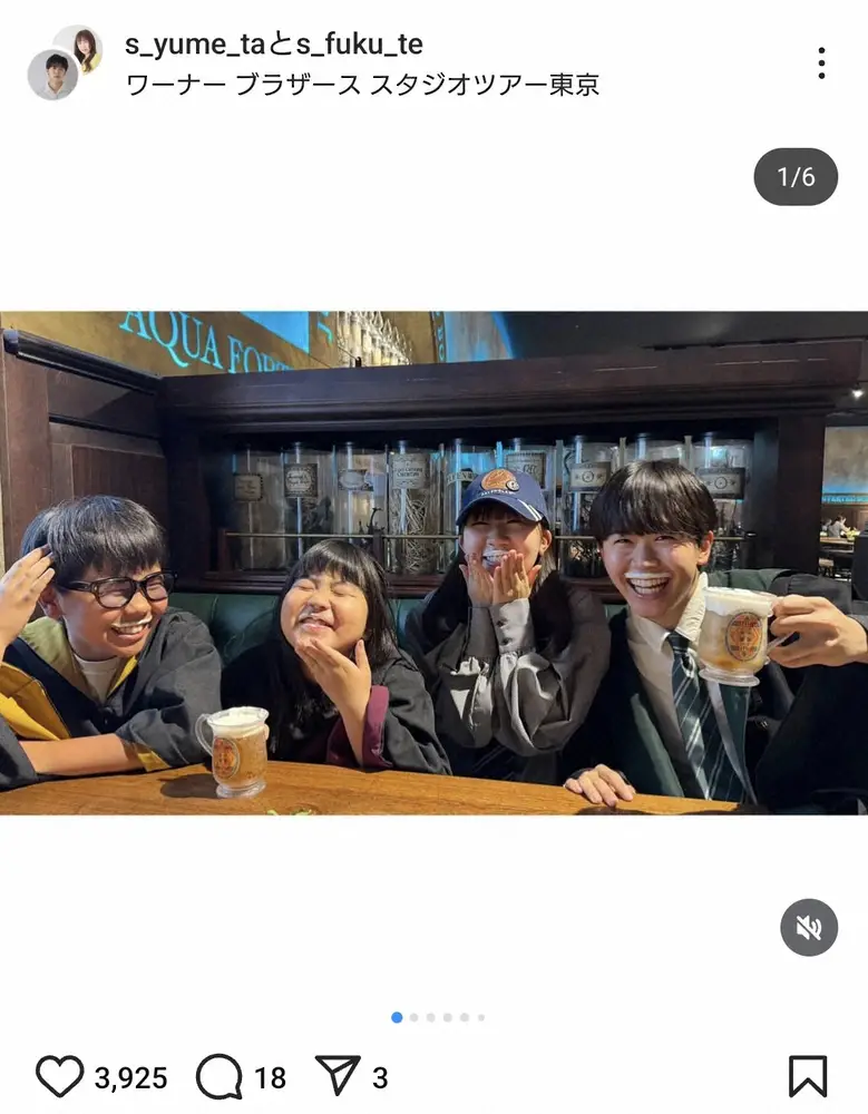 「兄妹4人+お兄ちゃんのお友達2人で行きました!1枚目のバタービールの写真がお気に入りです みんな楽しそうでしょ?!!ハリポタの世界観にずっと大興奮でした!!!」とつづると、ハッシュタグでは「ワーナーブラザーズスタジオツアー東京」「ハリーポッター」「ハリポタ」「また少しずつ写真公開します!」と添えた。