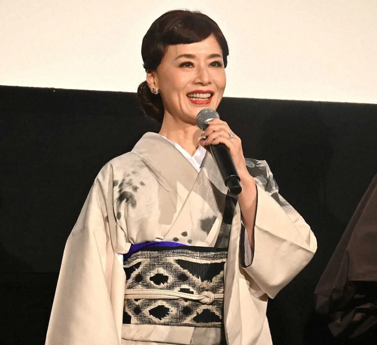 落ち着いた色合いの着物を着こなし、凜(りん)とした姿勢でゆっくりと登場すると、観客からは「きゃ~!」「凄い!」「奇麗」と黄色い歓声。69歳とは思えない美貌が目を引いた。