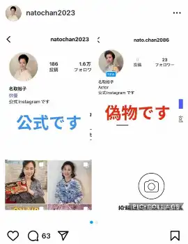 名取は「皆様にお楽しみ頂き私も楽しく投稿させていただいているのにまたまたニセモノ~」「気をつけてくださいませ~アカウント1つだけですから~他にはありませ~ん!」とコメントし、なりすましアカウントと自身のアカウントを比較した画像を公開。