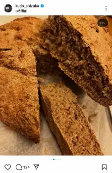 工藤は「今回は林檎とトマトの酵母 トマトは発酵が早くて強い!酵母水 ライ麦 全粒粉 オーツ 塩 オリゴ糖でシンプルに仕上げました」と、自家製酵母で作ったパンを披露し「もう、焼き立てを半分食べてしまった!笑笑笑笑」とつづった。