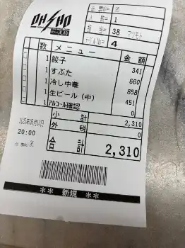 そこには「餃子:341円 すぶた:660円 冷し中華:858円 生ビール(中):451円 合計2310円」と記されていた。