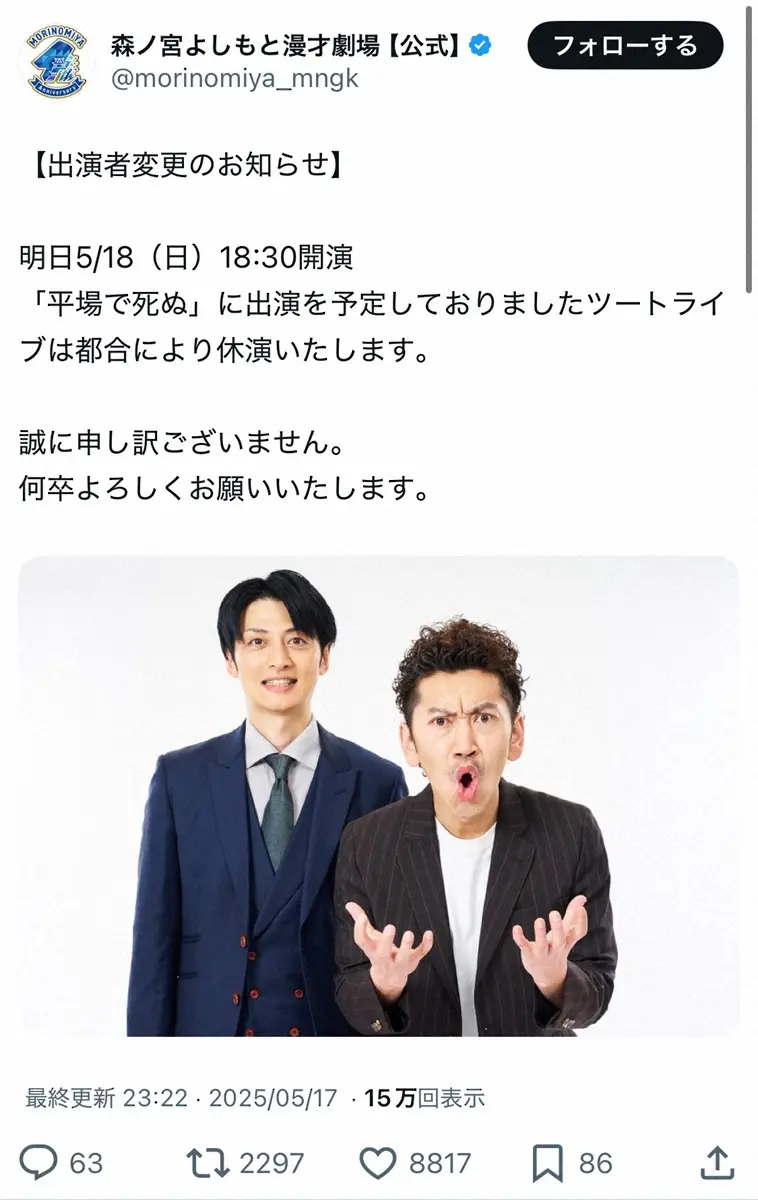 森ノ宮よしもと漫才劇場が公式Xで17日、ツートライブの休演を発表した。ツートライブは同日行われた賞レース「THE SECOND」で優勝。その直後の発表だった。