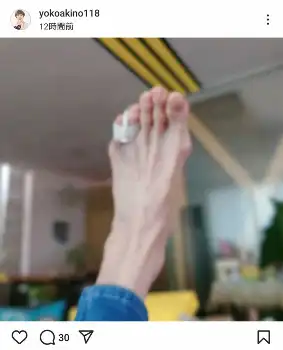 秋野は「足の小指~~やっちゃいました」とし、小指と薬指を固定した写真を投稿。「昨日、出かける前の支度中 小指と何やら固い物と喧嘩 小指の惨敗です」と説明。