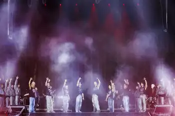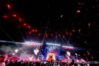 汗を散らしながら躍動するパフォーマンスが、湿気のこもった曇天のスタジアムをさらにアツくした。フィリックス(24)が「ヤッホー!」と叫び、「MOUNTAINS」で開幕。火柱や打ち上げ花火など、演出も屋外の巨大会場ならでは。リーダーのバンチャン(27)は「スタジアムの夢がかなった」と感無量の様子だった。