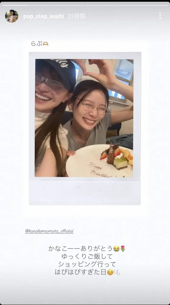 朝日は4月21日に31歳の誕生日を迎えており「らぶ かなこーーありがとう ゆっくりご飯して ショッピング行って はぴはぴすぎた日」と記した。