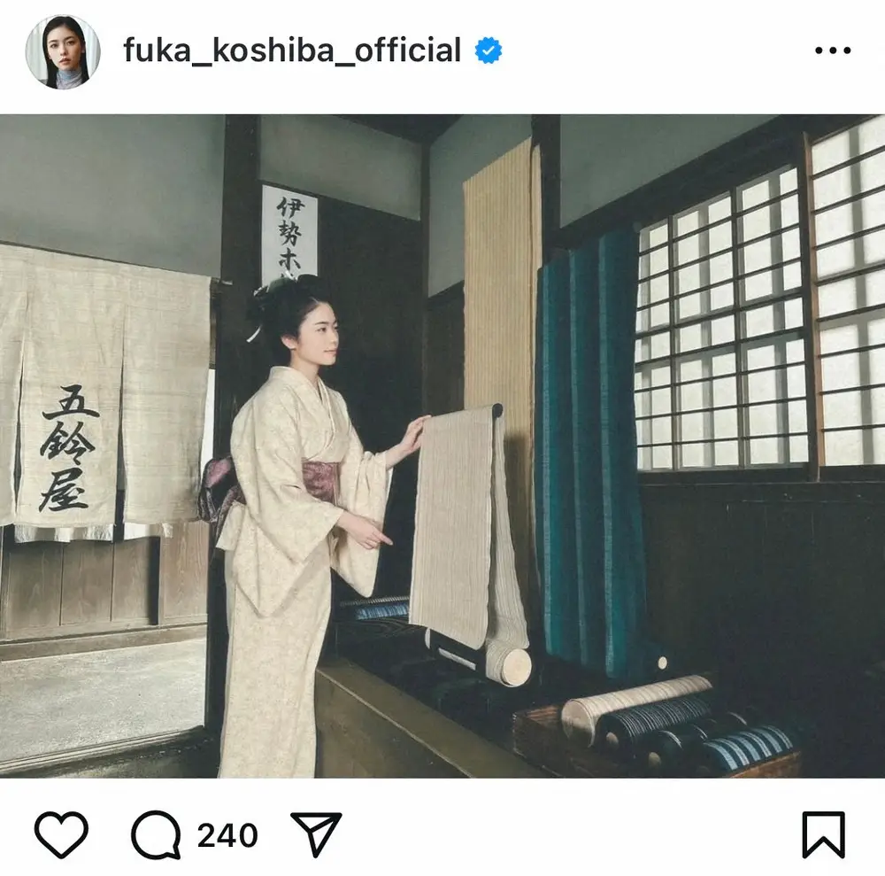 小芝は「BS時代劇『あきない世傳 金と銀』本日、第7回"鈴の小紋"の放送です NHK BS・NHK BSプレミアム4K 18:45~19:28」「ぜひご覧ください」と告知し、着物姿のオフショットを公開。「#あきない世傳金と銀 #幸と撞木と反物と」とハッシュタグもつけた。