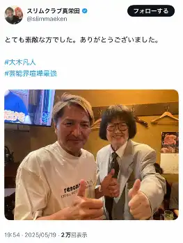 真栄田は、この投稿の約1時間前に「居酒屋で、目の前に大木凡人さんがいらっしゃるけど、挨拶した方が良いですか?ちなみに、初対面です」と投稿しており、ファンからコメント欄であいさつを促されていた。