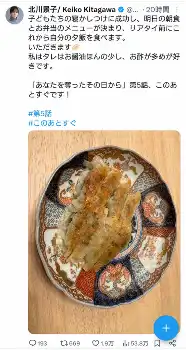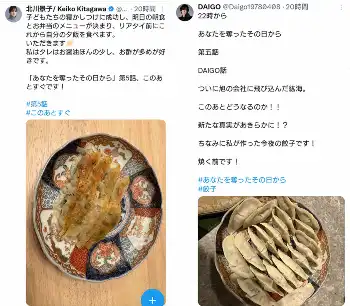 同ドラマの監督・松木創氏や、ドラマで北川の夫役を演じる俳優の高橋光臣も偶然にも夕食が餃子だったと報告すると、北川は「私は途中からラー油で、ただいま味変をしております!食べさせることに必死で食べそびれ、遅めの夕飯です こんな時間に餃子は背徳感がたまらないです」とコメントしていた。