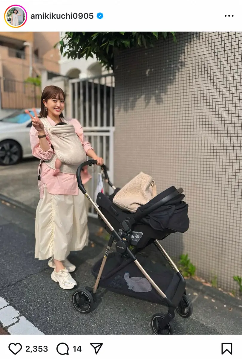 菊地は今年3月に第2子となる次女を出産。この日はベビーカーを押し、カメラに向かってピースするショットをアップした。