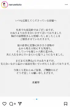 成瀬はタレントとして競馬予想番組やラジオ、イベントなどで活躍しており「彼の仕事に真摯に向き合う姿勢や 心から馬を大切にする気持ち、そしていつも優しい人柄に惹かれ、共に人生を歩んでいきたいと思うようになりました」とつづった。