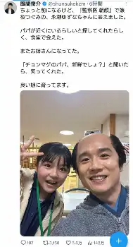 「ちょっと前になるけど、『監察医朝顔』で娘役つぐみの、永瀬ゆずなちゃんに会えました」と再会を報告した風間。永瀬とのツーショットを公開。風間はちょんまげ姿だった。