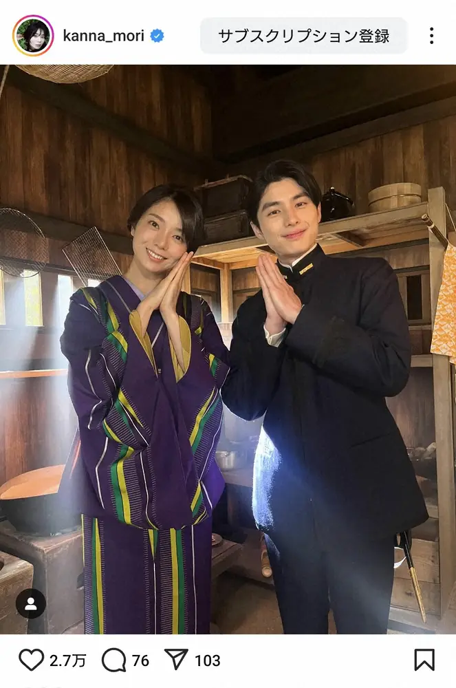 女優の森カンナ(36)が23日までに自身のインスタグラムを更新。現在放送中のフジテレビドラマ「波うららかに、めおと日和」(木曜後10・00)で共演中のブレーク俳優とのオフショットを披露した。