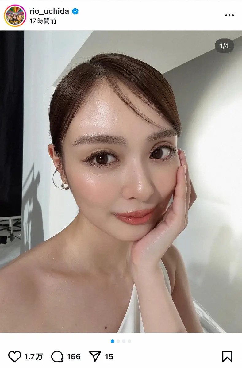 内田は「いつもよりしっかりメイク うるつやにしてもらいました」とし“ドアップ”の自撮りを投稿。白いドレスを身にまといCM撮影に臨んだことを報告した。