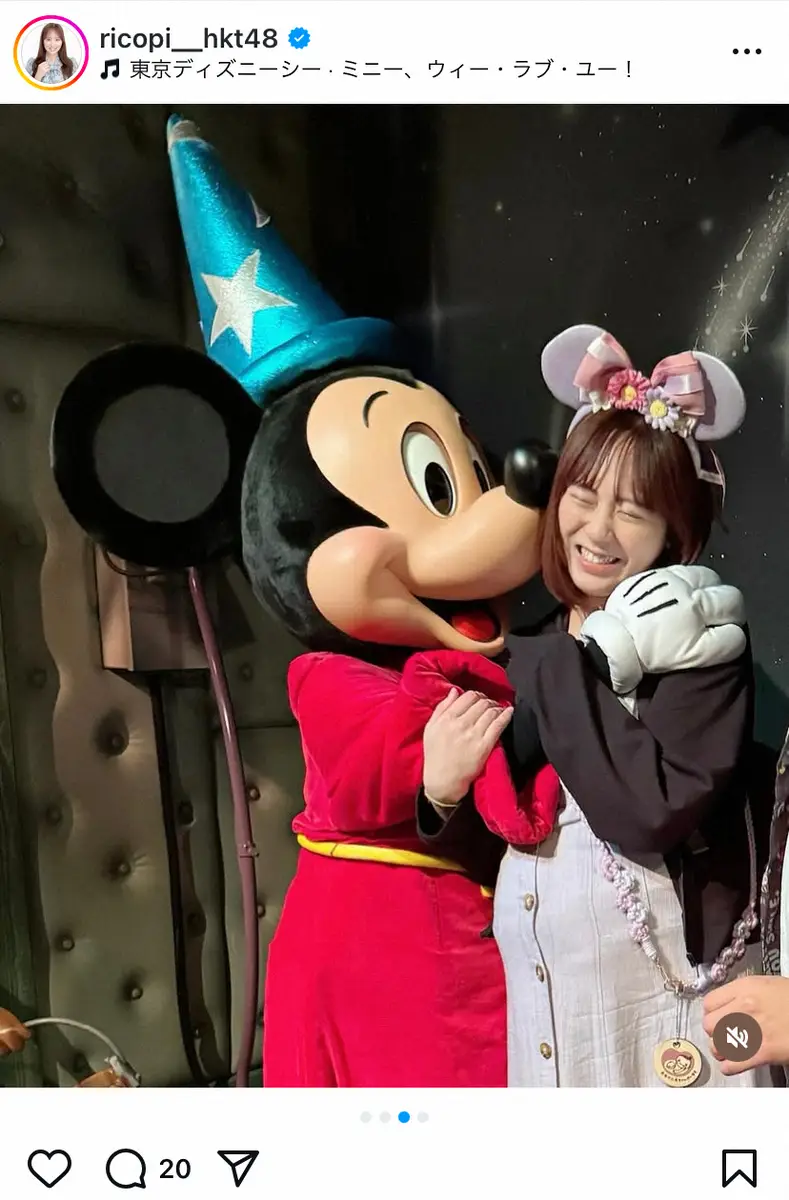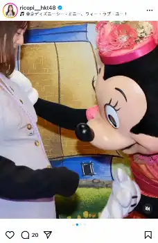 また、自身のふっくらとしたおなかに、ミッキーやミニーが顔を寄せる近影も公開。ミッキーたちにおなかを触ってもらうことが「1番の安産祈願」と記すほど念願だったようで、「思い出にここにも残させてください、、ミッキーがお腹にちゅってしてくれたんだー赤ちゃんがいるんだー!って言ったら、夫の肩を叩いて祝福してた。笑」と泣き顔の絵文字を添えてつづった。