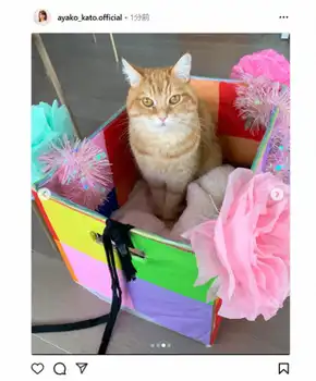 加藤は「少し前ですがバス作りました」と書き出し、段ボールでできたお手製のバスを製作したことを報告。「たまにマロも乗ります」と愛猫が手作りバスに乗るかわいらしい写真をアップし、「大きな荷物が届いたときの段ボールをみたらそのまま捨てるのは勿体ないなと… せっせと作ってみたら結構良い感じに出来て装飾も頑張りたくなり後日買い出しへ 結果派手派手に」と、経緯を明かした。