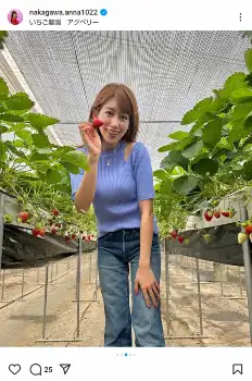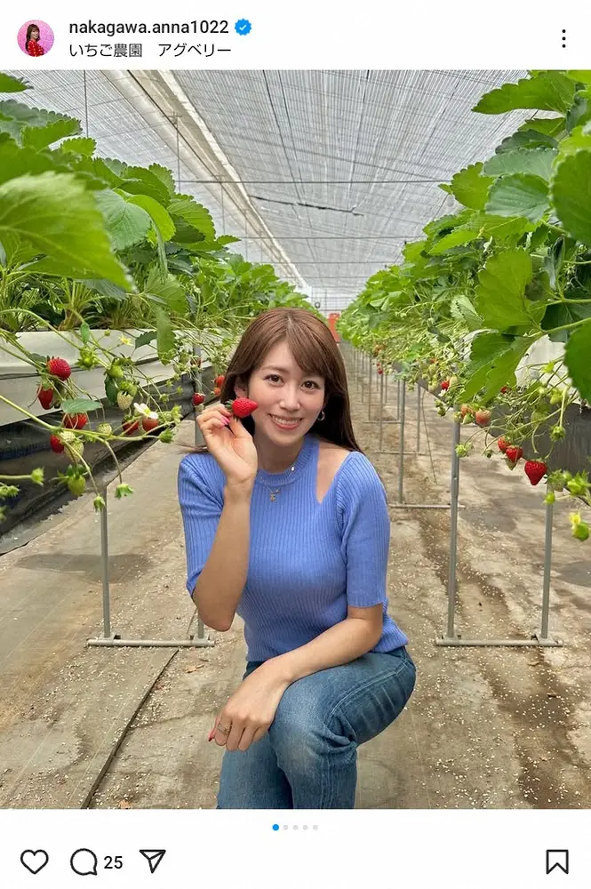 中川は「大学時代の友達が声をかけてくれて、いちご狩りへ」と報告。「おいしくてたのしくてかわいくて…みたされましたっ」と、ブルーのニットにデニムを合わせたファッションで、イチゴを手にした写真を公開した。