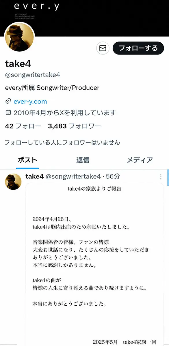 take4さん(ever.y公式サイトから) NEWSの楽曲制作で知られるtake4さん 脳内出血のため死去していた 遺族、… ギャラリーで見る この記事のフォト 2025年05月29日の画像一覧 もっと見る 2025年05月29日の画像をもっと見る