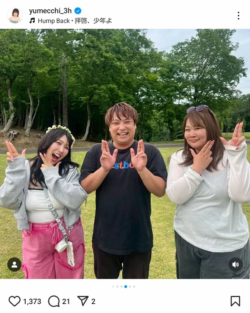 ゆめっちは「お新潟にいるチカポンとはまやねんと遊んだ~」と報告。「ぽかぽか太陽に恵まれたよね」と、現在は新潟住みます芸人として活動するピン芸人のチカポンことチカコホンマ、お笑いコンビ「8.6秒バズーカー」はまやねんとの3ショットを公開した。