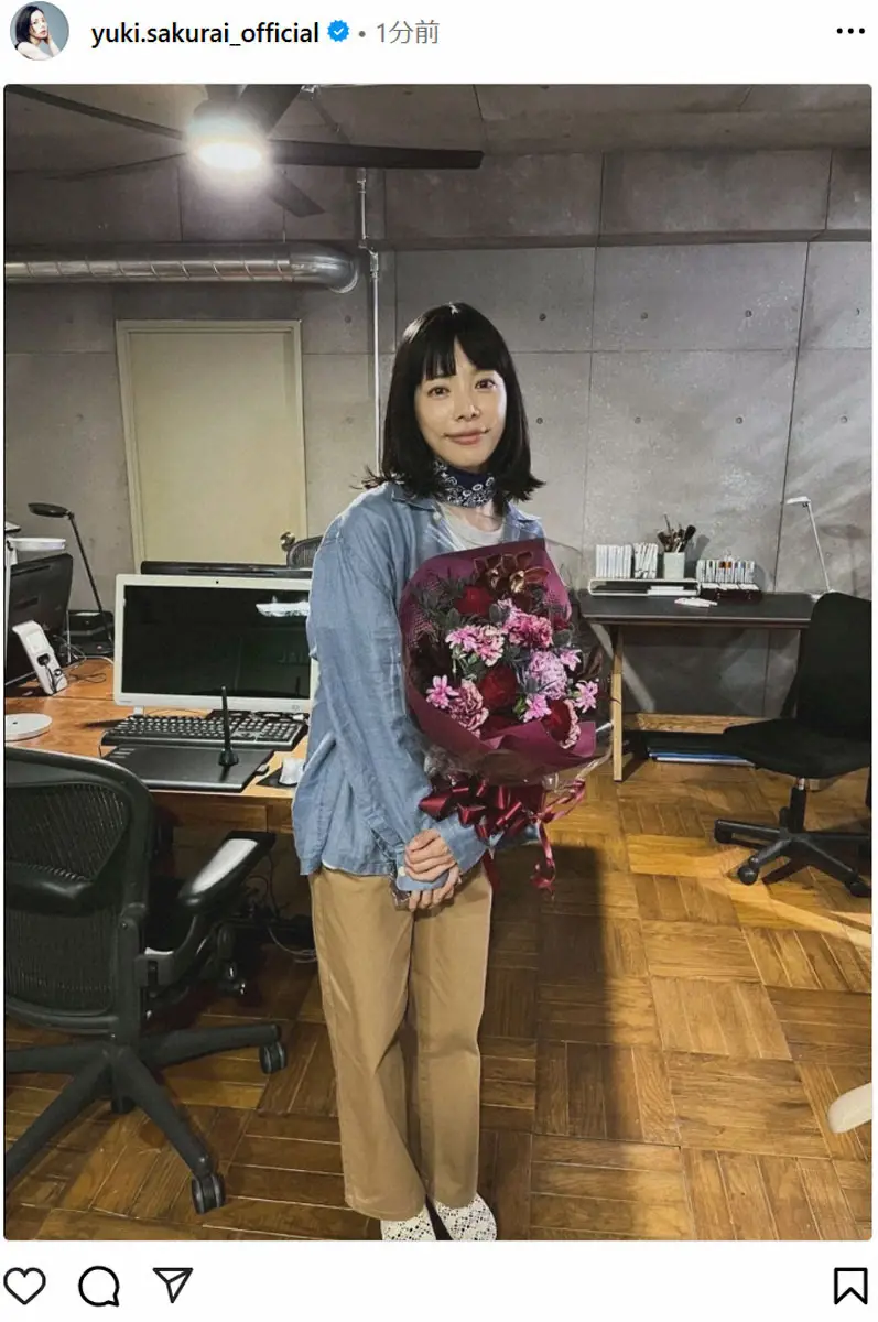 花束を手にしたオフショットを公開した桜井。「『しあわせは食べて寝て待て』最終話までご覧いただき、本当にありがとうございました」と書き出した。