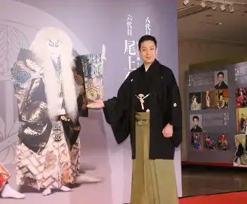 <<尾上菊之助改め八代目尾上菊五郎 尾上丑之助改め六代目尾上菊之助 襲名展>>展示会をアピールする尾上菊五郎