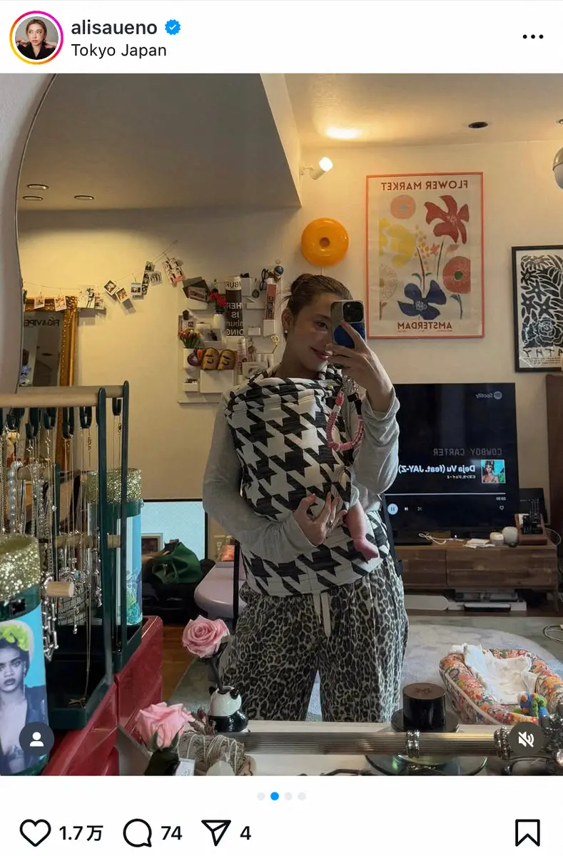 この日はわが子を抱いてあやすショットや、抱っこ紐でおぶった姿の鏡越しの自撮りをアップ。長男との新しい日々の中、「Can’t take my eyes off of you(あなたから目が離せない)」とハートの絵文字を添えてコメントした。