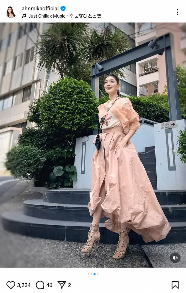 この投稿にフォロワーからは「大人のサーモンピンク可愛い」「全身絶妙な統一感」「アンミカさんお姫様の様ですね」「ブラボ~」「シュークリームみたいなスカート」「まるでパリコレファッション!!」「お綺麗!天女かと思いました」などのコメントが集まった。