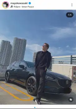 川崎は「愛車のMAZDA6がよりカッコ良くなって帰って来た!」と投稿。フロントグリル周りのメッキやドア周りのメッキモール、エンブレムまでオールブラックに塗装した愛車とのショットを公開した。