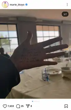 作中で日本語とイタリア語の掛け合いを披露した飯豊は、過去に公開記念舞台あいさつに登場した際、撮影では「私はズルしてた…。手にイタリア語を書いていたんですけど、それを監督が許してくれて」と告白。掲載された写真の中には、飯豊の手に書かれた“カンペ”が写っており、ファンは「本当に手に書いているんですね!」とコメントで反応した。