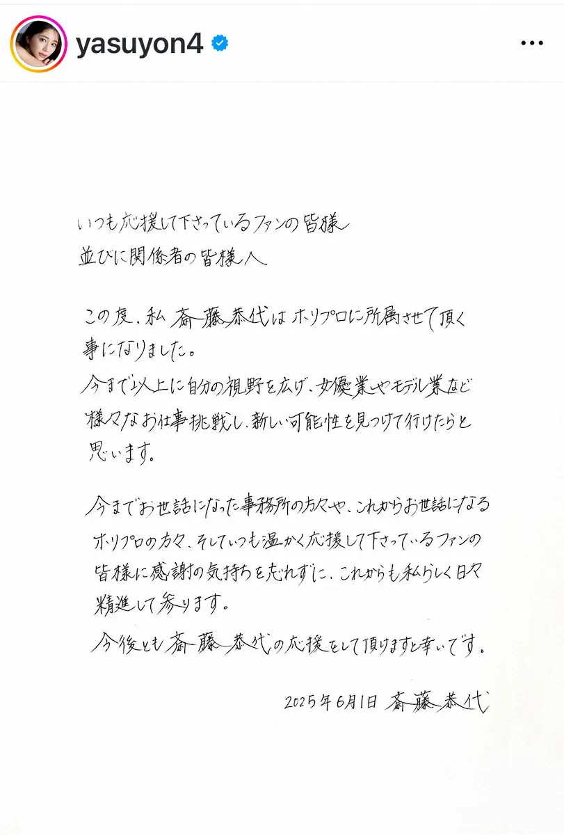 斎藤恭代公式インスタグラム(@yasuyon4)から “令和のキューティーハニー”斎藤恭代 ホリプロ所属に「これからも私らし… ギャラリーで見る この記事のフォト 2025年06月03日の画像一覧 もっと見る 2025年06月03日の画像をもっと見る