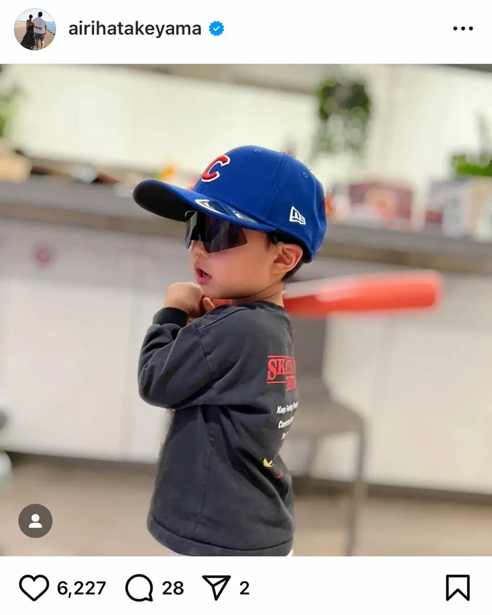 「最近長男はパパのマネをするのが大好き」と書き出した畠山。カブスの帽子に子供用のサングラスを着け、バットを構えた長男の写真を投稿した。
