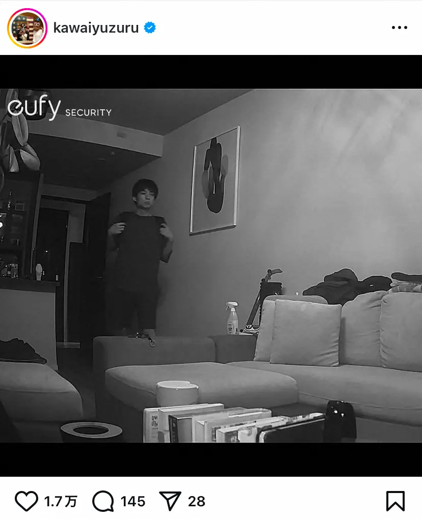 河井は「全然ベロベロになるまで飲んだりしていないのに、家に帰ってきてソファでテレビを見てたりしてる内に急にパタンと寝てしまう事があまりに多い為、満45歳独身河井、ペットカメラを設置致しました。(勿論ペットは飼っておりません)」と報告。ペットカメラで撮影したものと思われる帰宅時のモノクロ写真を投稿した。