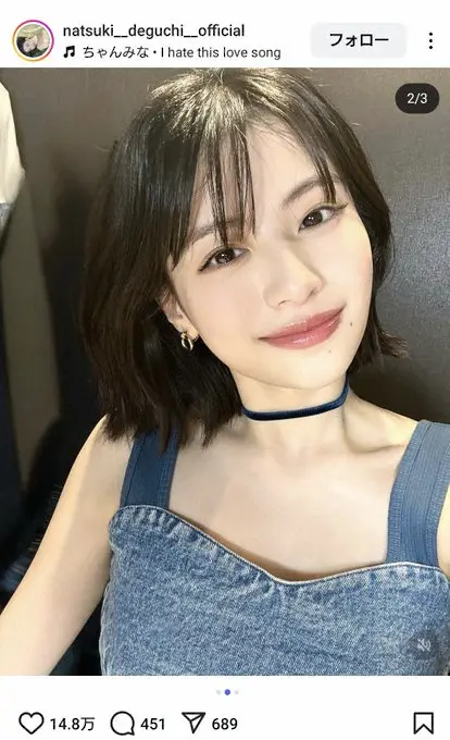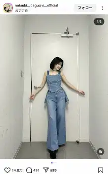 青いハートの絵文字を3つ添え、デニムのセットアップを着こなしての全身写真や上半身のアップショットなど3枚の写真を公開。2日に都内で行われた映画『か「」く「」し「」ご「」と「』の公開後舞台あいさつの衣装姿を掲載した。