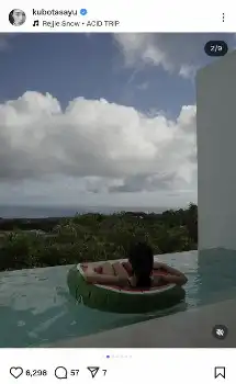 プールでスイカの浮き輪を使い、ゆったりと浮かぶ様子も公開。絶景のプールサイドに映える写真だ。