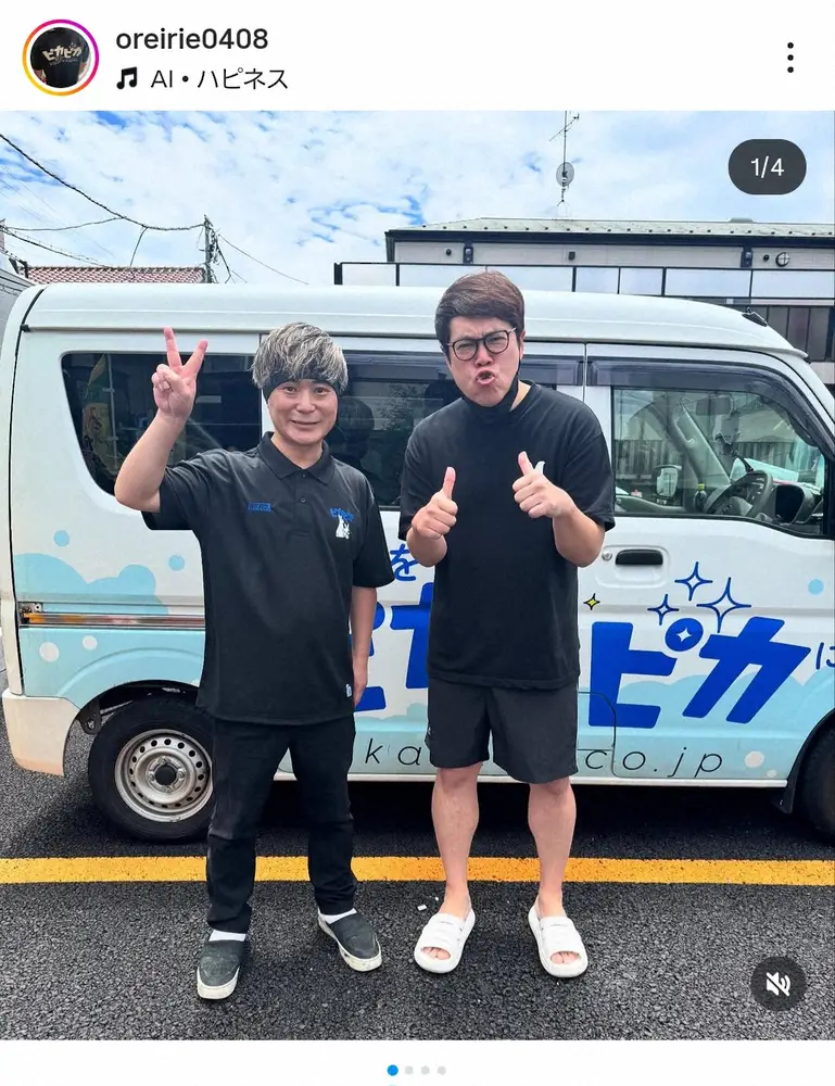 さらに「そんな日に先輩のタカトシのタカさんにエアコンクリーニングのご依頼をいただきました」と明かし、お笑いコンビ「タカアンドトシ」のタカとのツーショット写真を公開。