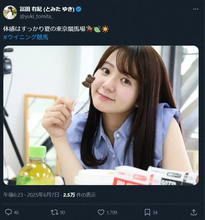 自身のXで「体感はすっかり夏の東京競馬場」とつづり、うさぎのチョコを持った夏らしいブルーのノースリーブブラウス衣装姿を公開した。