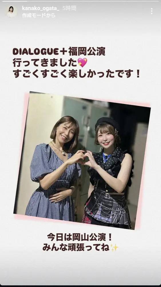 佑奈は声優ユニット「DIALOGUE+」メンバーでもあり、かな子はストーリーに「DIALOGUE+福岡公演行ってきました」とハートの絵文字と共に記すと、紺のチェックのワンピース姿の自身と、黒を基調にした衣装姿の佑奈が手でハートを作る親子ショットをアップ。