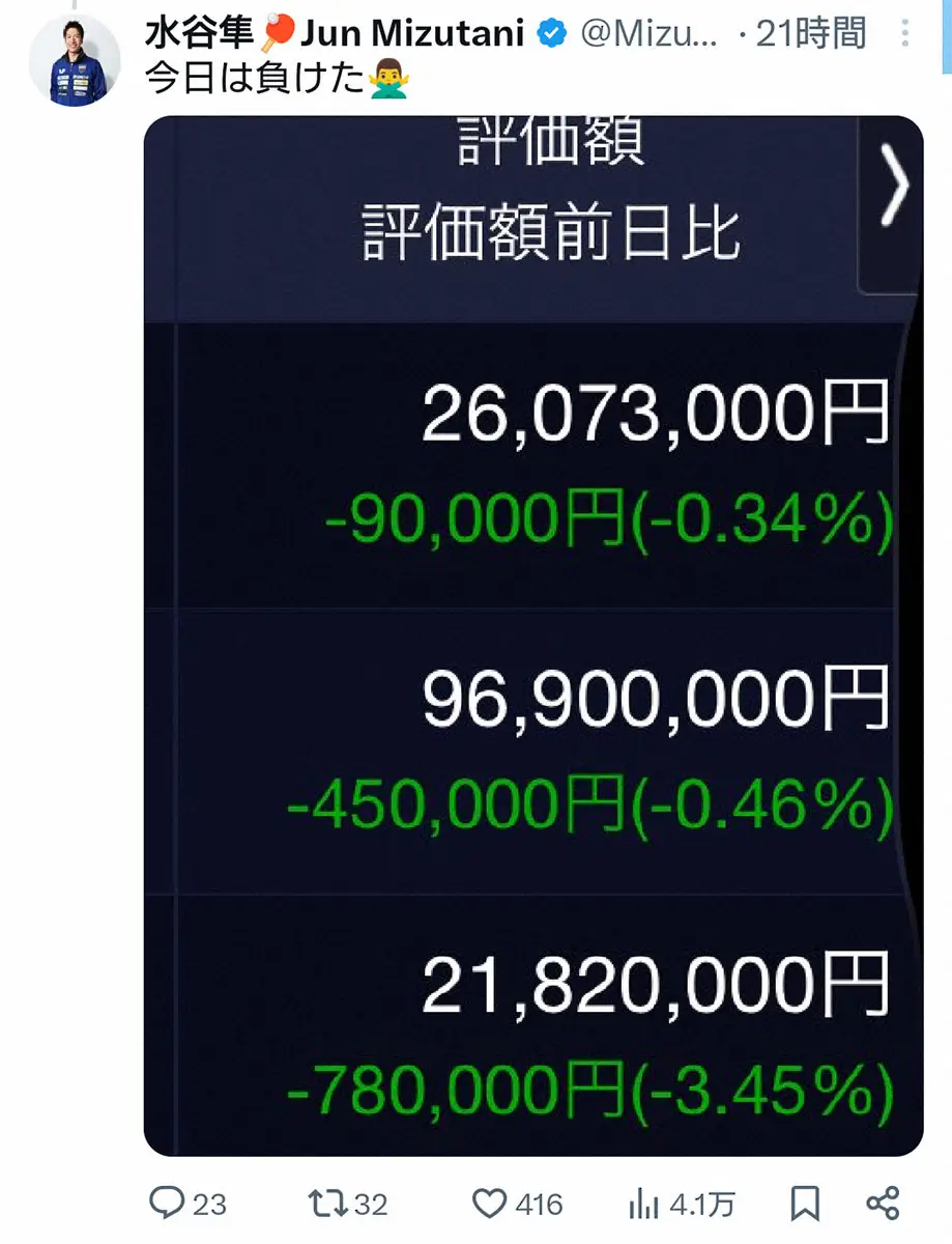 水谷隼氏公式X(@Mizutani__Jun)から 水谷隼氏 誕生日に「株とFXで大勝利して本だす」と抱負も「今日は負けた… ギャラリーで見る この記事のフォト 2025年06月10日の画像一覧 もっと見る 2025年06月10日の画像をもっと見る