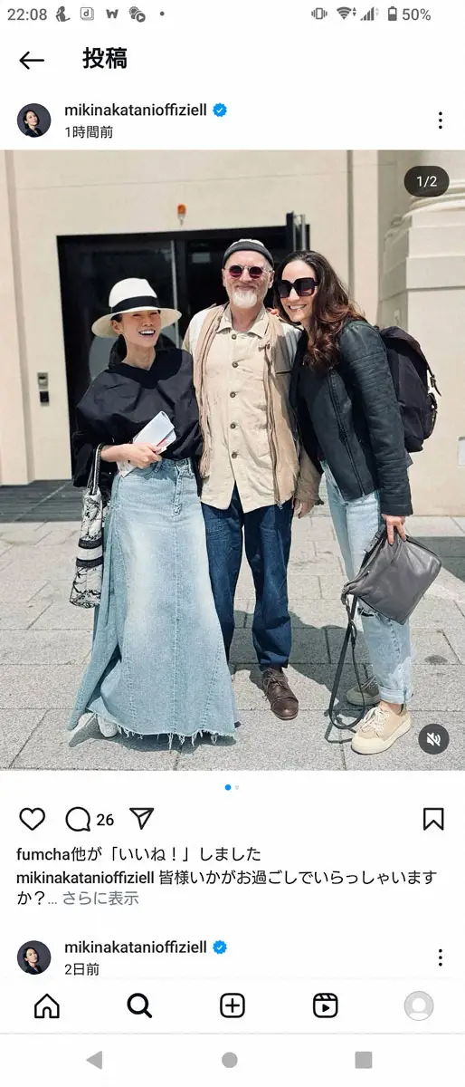 また「まさかお目にかかれるとは寸分も期待しておらず、ノーメイクで近所にパンを買いに行くような無防備な姿で出かけたもので、ためらいつつも、お話しさせていただくことが叶いました。さらには、ヤン・ロワースさんが、お嬢様のロミー・ルイーズ・ロワースさんをご紹介くださった上、お手ずからお写真を撮ってくださったのです」と、デニムのロングスカートにシャツ、帽子姿で写真に納まる様子を披露。