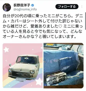 荻野目洋子X(@oginome_info)から 荻野目洋子 「自分が20代の頃に乗ったミニがこちら」「愛着ありました」… ギャラリーで見る この記事のフォト 2025年06月12日の画像一覧 もっと見る 2025年06月12日の画像をもっと見る