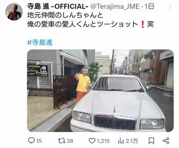 寺島は「地元仲間のしんちゃんと 俺の愛車の愛人くんとツーショット!」とつづり、愛車との写真を投稿した。
