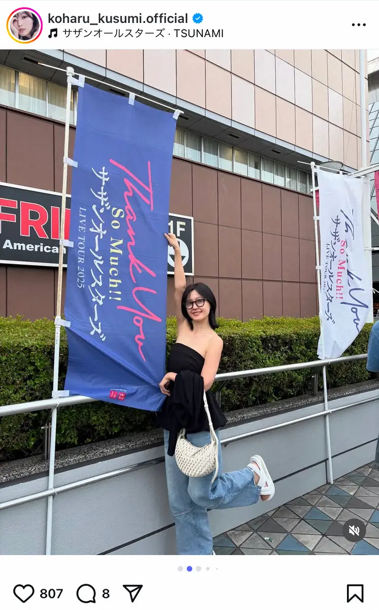 久住は「少し前ですが行きたかったサザンオールスターズさんのLIVEに初めていきました」と報告。会場ののぼり旗に手を添えた写真や、ゲットした銀テープを披露するショットを公開した。