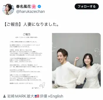 春名風花のX(@harukazechan)から 早泣き天才の元子役“はるかぜちゃん”春名風花が結婚 お相手は岩崎MARK雄… ギャラリーで見る この記事のフォト 2025年06月14日の画像一覧 もっと見る 2025年06月14日の画像をもっと見る