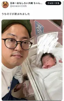 大崎は「うちの子が産まれました」とつづり、赤ちゃんの写真をアップした。これに対して、「おめでとうございます」「日本一おもしろい父ちゃんおめでとう!!!!!!」の祝福の声や、持ちネタを用いた「ちょんてすなよ」などの声が寄せられた。