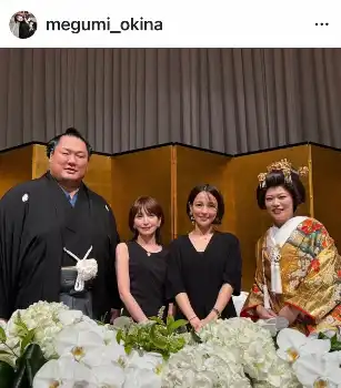 ハッシュタグでも「#結婚式」「#高田川部屋」「#輝」「#おめでとう」「#若元春」「#錦木」「#王鵬」「#夢道鵬」「#大辻」「#国仲涼子」「#奥菜恵」「#大相撲」「#相撲好き」と添えた。