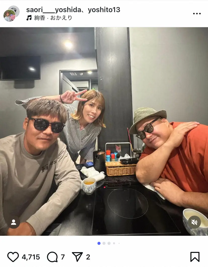 吉田さんは「よっくんお帰り~ スペインから一時帰国 という事で、食事に行ってきました」と書き出し、公私ともに交流のある大久保氏、大相撲の元関脇でタレントの豊ノ島との3ショットをアップ。