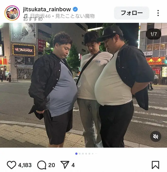 3人合わせて「平均身長186cm 総体重341kg」だといい、お腹を突き出したポーズを掲載。「見たことない化物です」とつづっていた。
