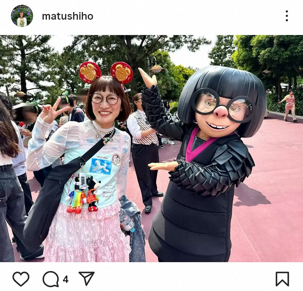 「Mr.インクレディブルのエドナ・モードに会えた!嬉しい!似てる!!」とつづった松浦。ボブヘア&眼鏡が共通しているエドナ・モードとのツーショットを公開。松浦の左胸にはバースデーシールがあり、「ファッションデザイナーのエドナ・モード!格好いいエドナ・モードに誕生日おめでとうしてもらえた!嬉しい!!」と祝福されたことを喜んだ。