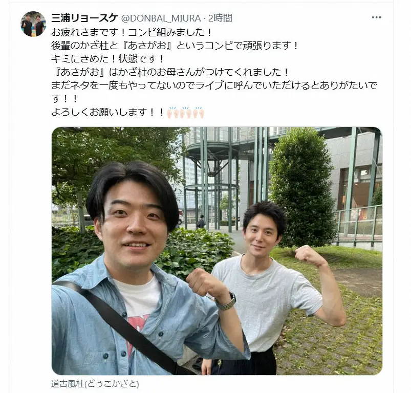 三浦は「お疲れさまです!コンビ組みました!後輩のかざ杜と『あさがお』というコンビで頑張ります!キミにきめた!状態です!」とコンビ結成を報告。新たな相方は元「ミヤコジマ」どうこかざとだと明かした。
